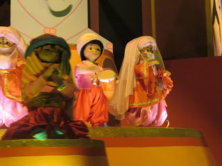 The next thing we saw was the Halloween parade. It started with the gallop of a black horse and on top of this horse was the headless horseman. He was really impressive; as he managed to not crash into the viewers watching behind the white ropes. He kicked off an excellent parade. Mickey Mouse, Winnie the Pooh, Jack Sparrow and many more made an appearance to celebrate Hallows end. I was impressed with the gravediggers as they were using shovels in their mystic dance routine. They even created sparks on the floor! Also, Donald Duck blew a kiss to the camera which was sweet. To end the parade, the villains went bump in the night. I saw Jafar, Captain Hook & even the bad guy from Meet the Robinsons! I forgot all about that film! This parade was really good and I am glad I got to witness it.